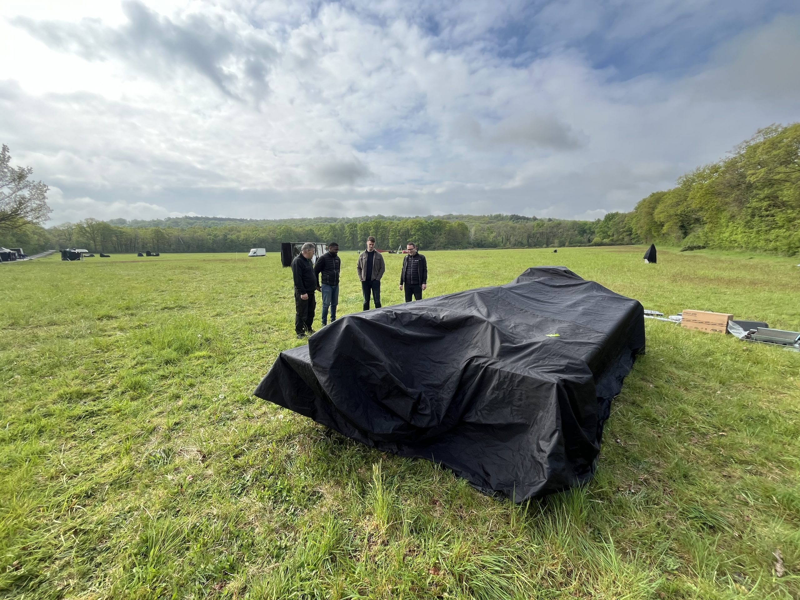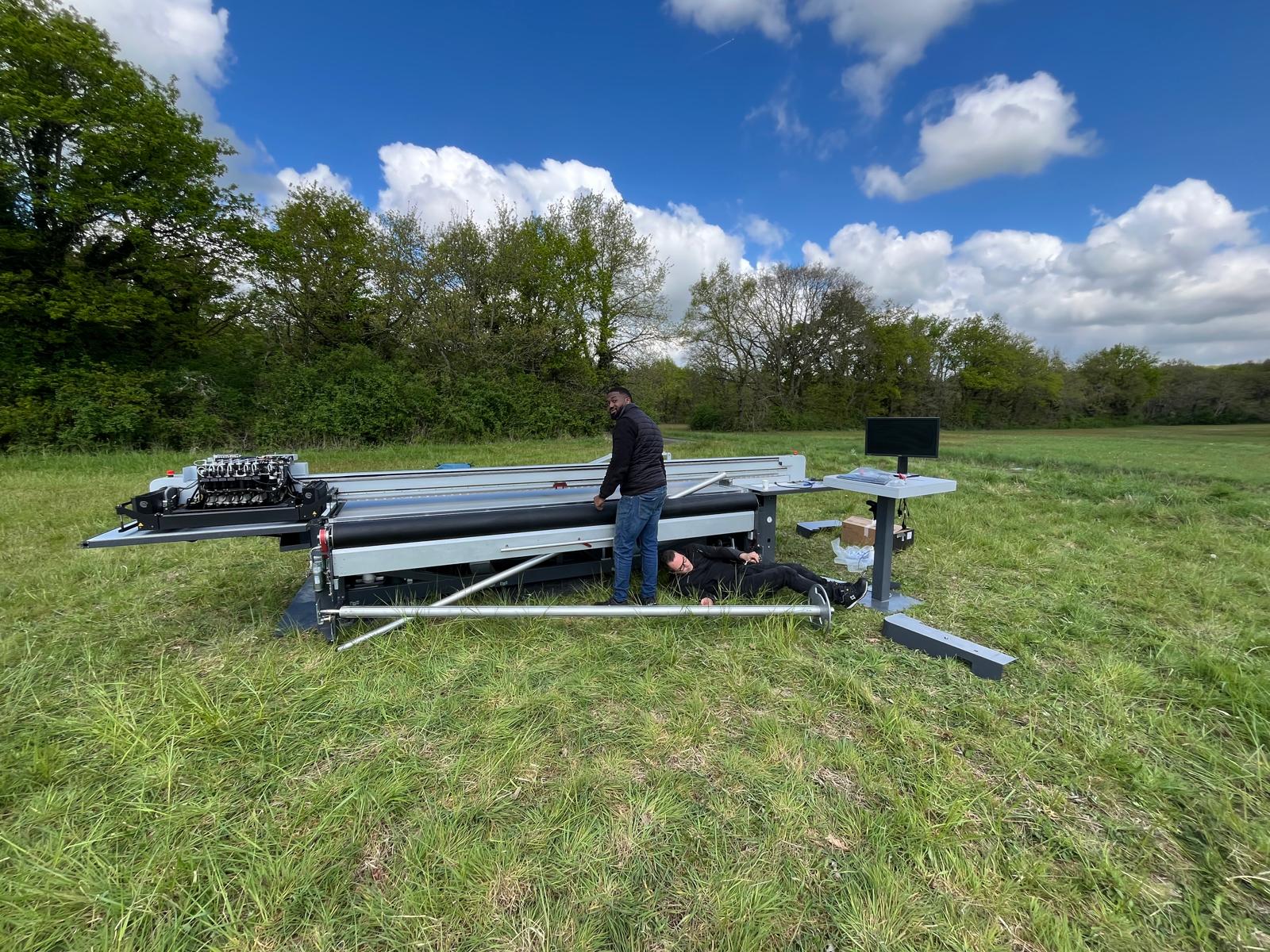 swissQprint a ainsi été sollicitée pour fournir et faire fonctionner une imprimante à plat de très haute précision, une swissQprint Nyala, dans un environnement complètement inhabituel : un champ irrégulier, sans infrastructure, exposé aux caprices de la météo. À larrivée des équipes, une pluie persistante a obligé à maintenir l’équipement protégé sous bâche, encore installé sur le camion.